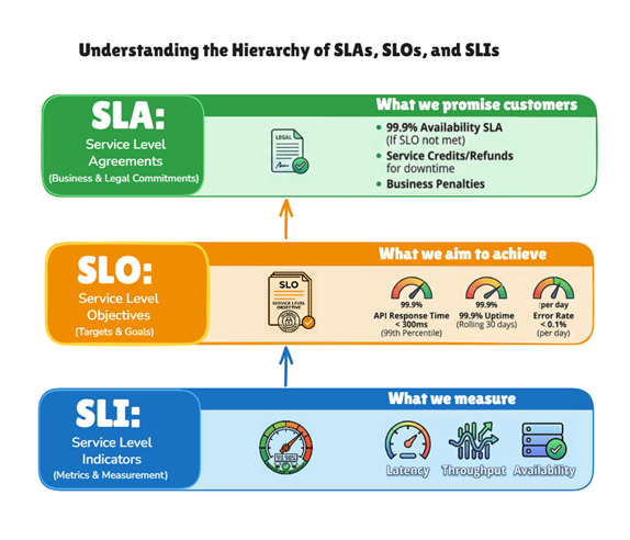 The diagram below shows how all three concepts stack up together: SLIs inform SLOs. SLOs protect SLAs. Break that chain at any point and you're either flying blind or heading for a breach.